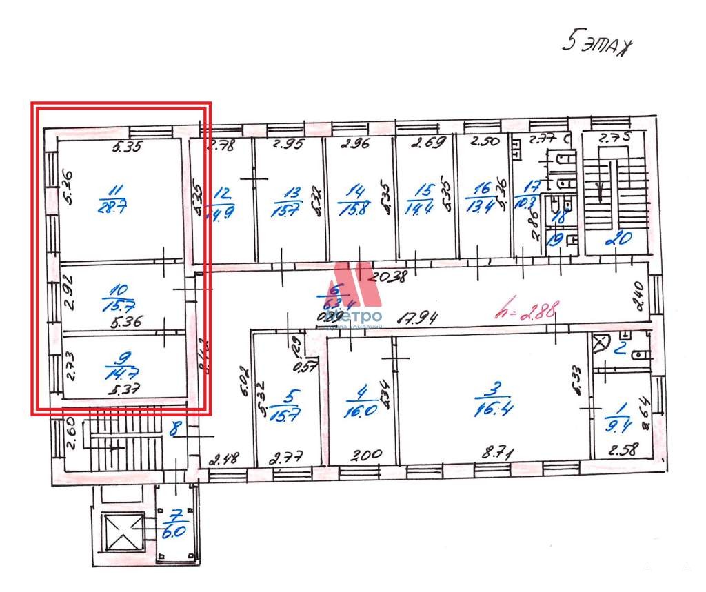 Общая площадь 62, 3 кв.м. , 5 этаж с лифтом. Три кабинета с общим входом.
