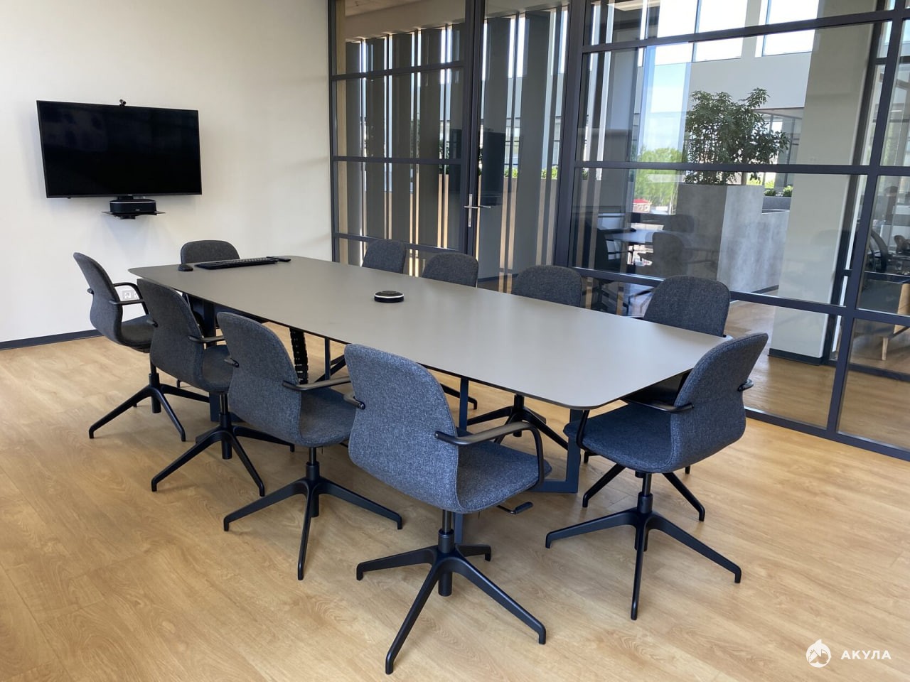 Закрытая переговорная комната оснащена оборудованием для видеоконференций.