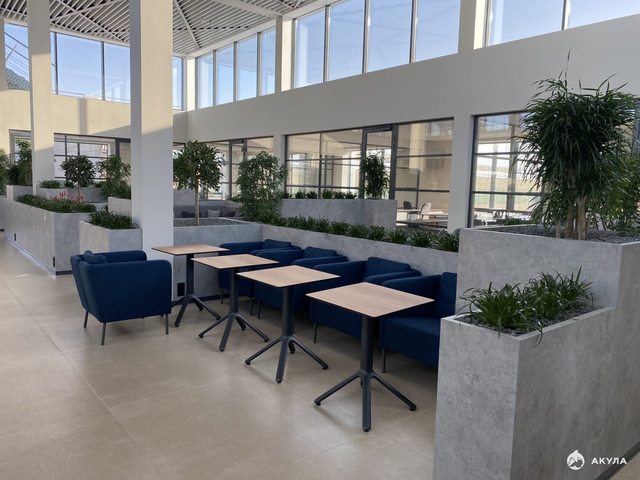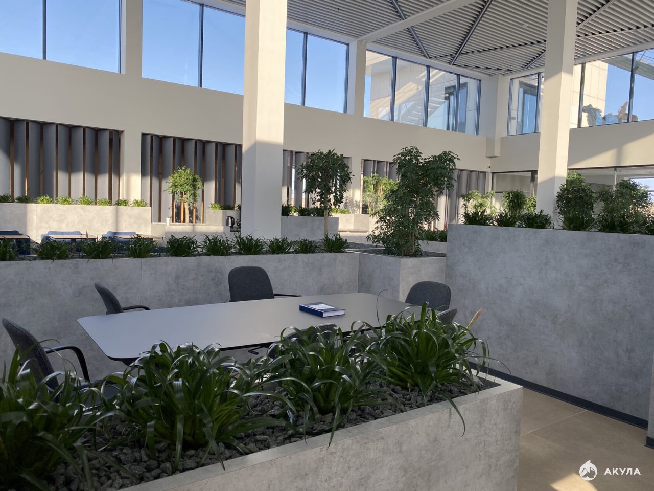 Лаунж-холл с панорамным остеклением и дизайнерским растительным ландшафтом наполнен естественным цветом и включает в себя зоны для переговоров и кофе-брейка.