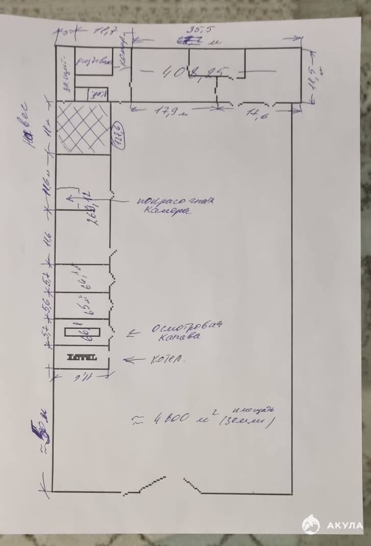 Помещение разделено на часть с гаражным боксом и теплое помещение (раздевалки, душ, офисное плюс большое чистое помещение)
