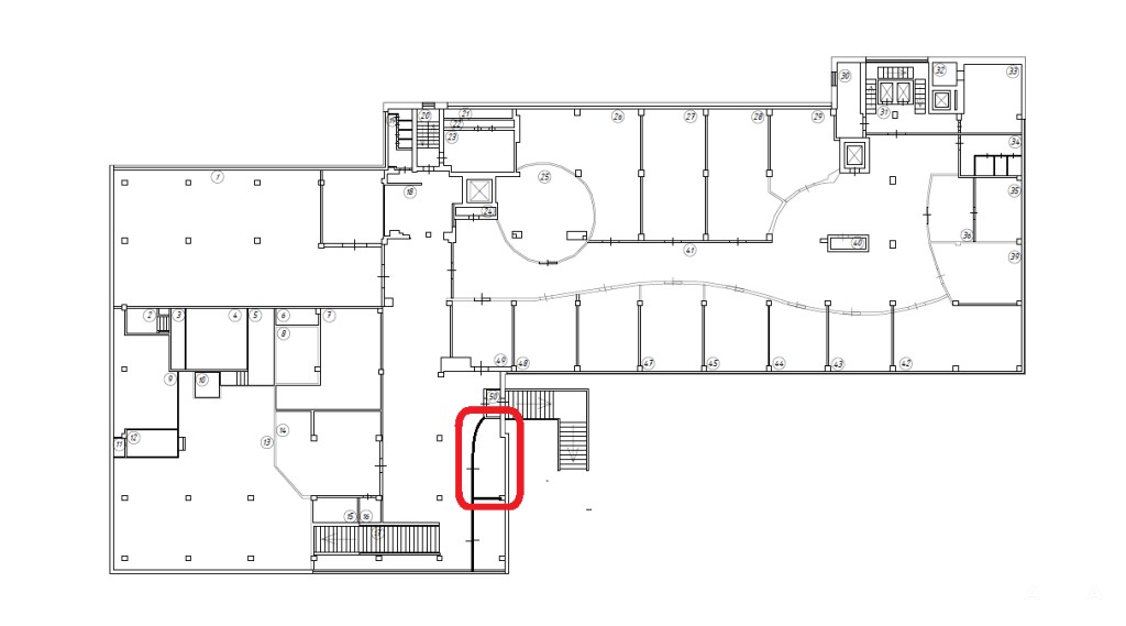 На внутреннем трафике бизнес-центра, рядом со внутренним входом в Магнит. На техплане выделен красным контуром.