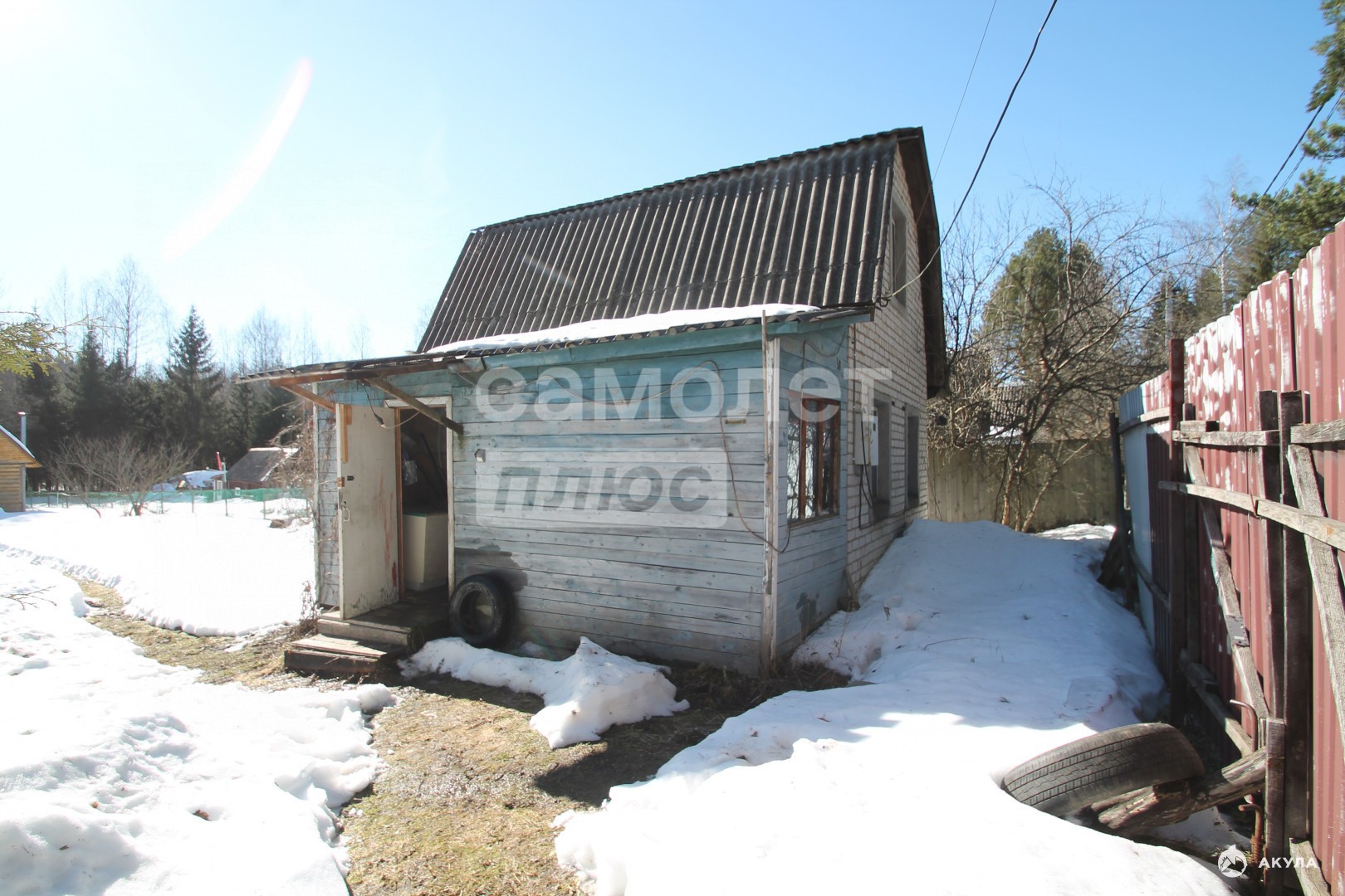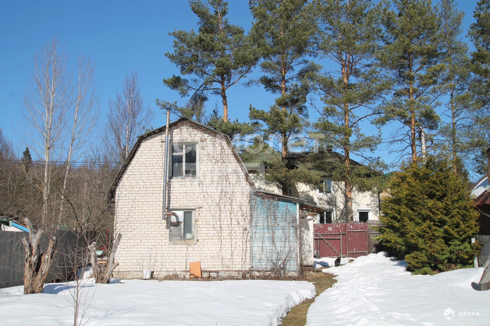 - Дом из белого кирпича 5, 5×5 м с пристройкой (хозблок). Можно оборудовать для круглогодичного проживания. Для обогрева зимой — буржуйка.