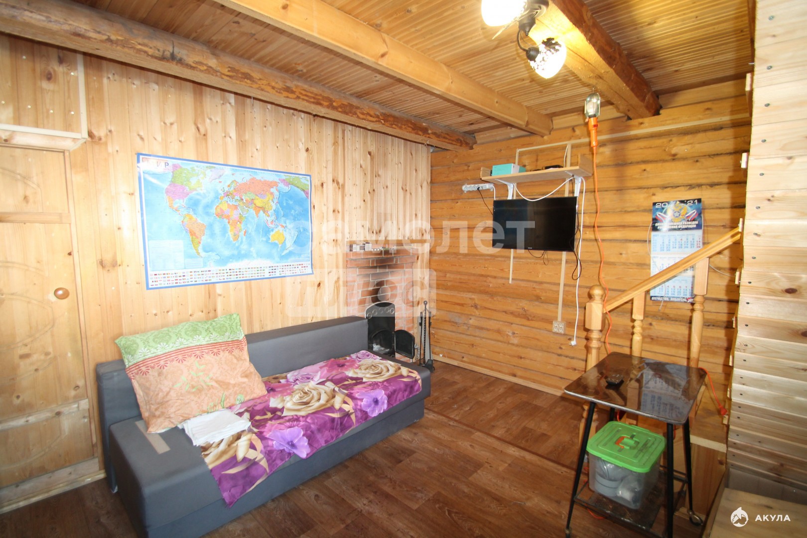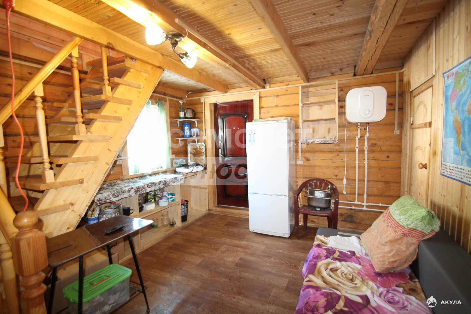 - В бане: стеклопакеты, гостиная с кухней (холодильник, мойка, водонагреватель), комната с душем и стиральной машиной, парная из липы (пол и стены частично выложены плиткой).