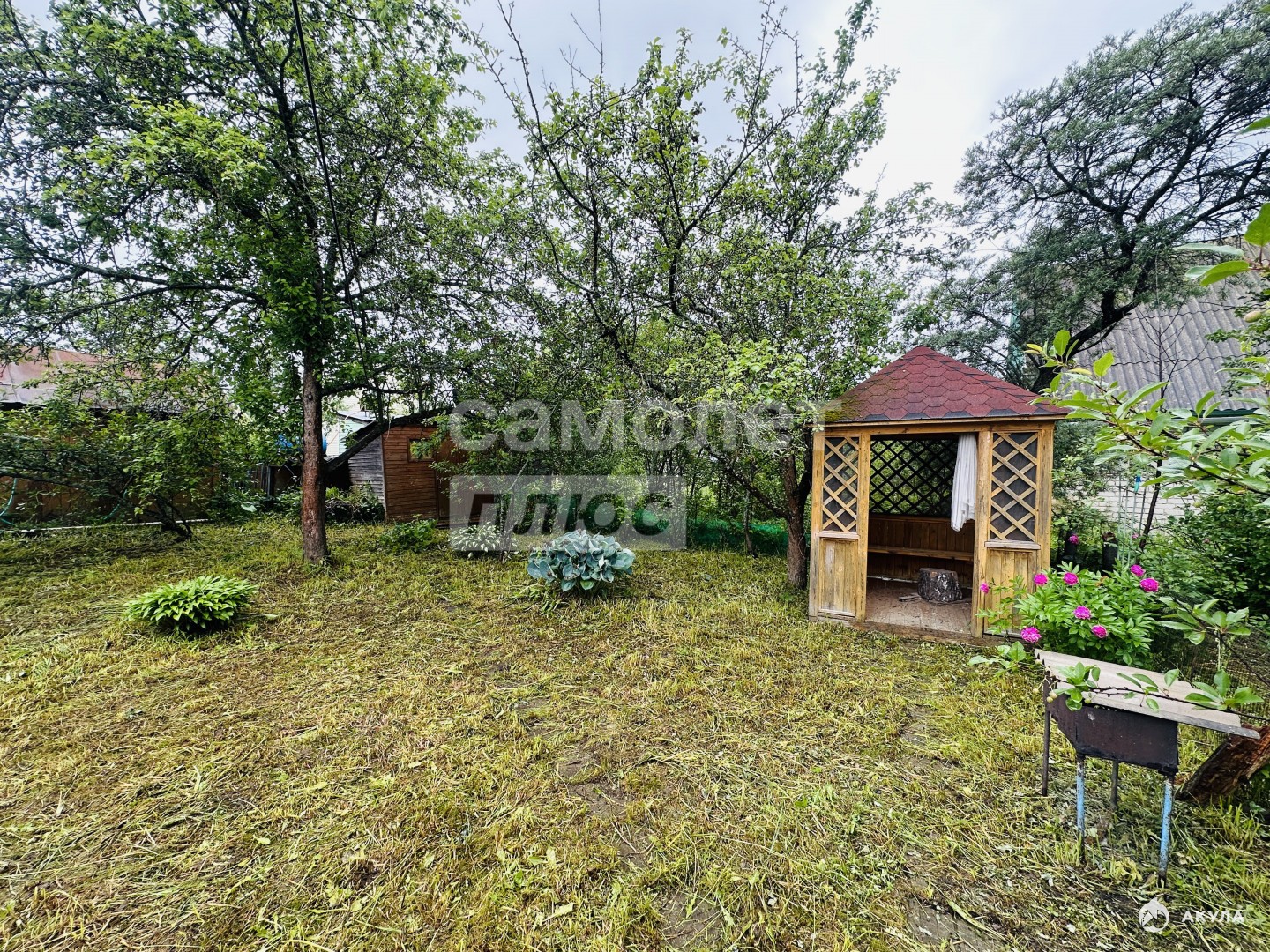 Участок огорожен забором. Имеется беседка, баня с комнатой для отдыха.