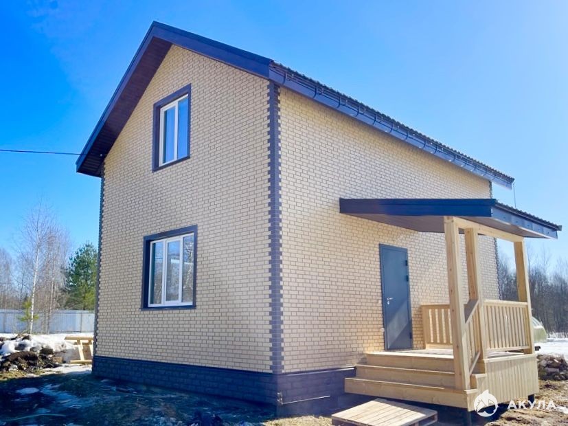 Дом из газосиликатных блоков, снаружи обшит пластиковыми панелями под маяк с имитацией декоративного кирпича.