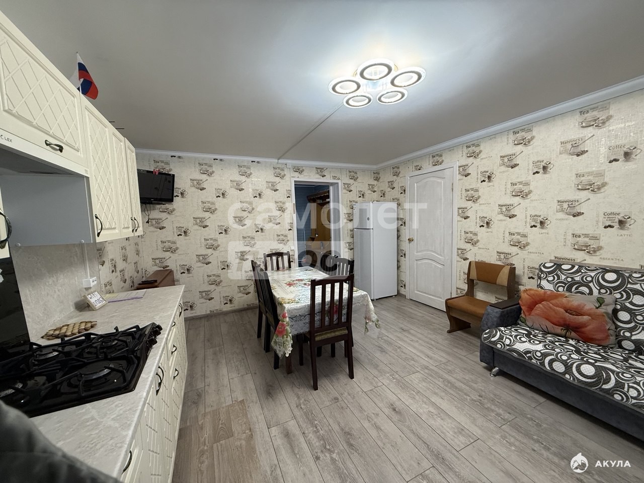 В доме – просторный холл, 2 изолированные уютные комнаты и большая 20 метровая кухня-гостиная с диваном, санузел совмещенный с душевой.
