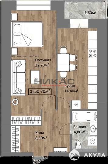 Комфортная планировка 2-евро: просторная кухня-гостиная 14, 4 кв.м. с выходом на застекленную лоджию, изолированная комната 22, 2 кв.м., совмещенный сан.узел, удобная функциональная прихожая 8, 5 кв.м.