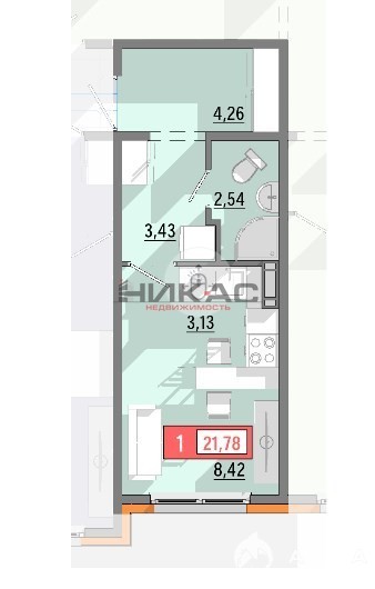 1 ком. квартира студия 21.7 квм.