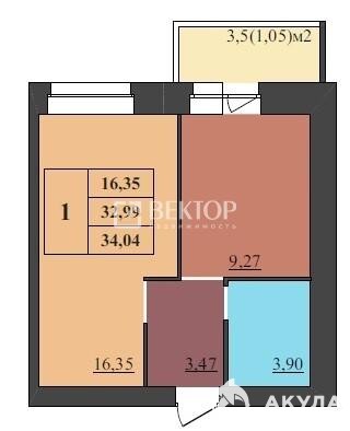 • Параметры: 4 этаж из 9, общая площадь — 34, 4 м².