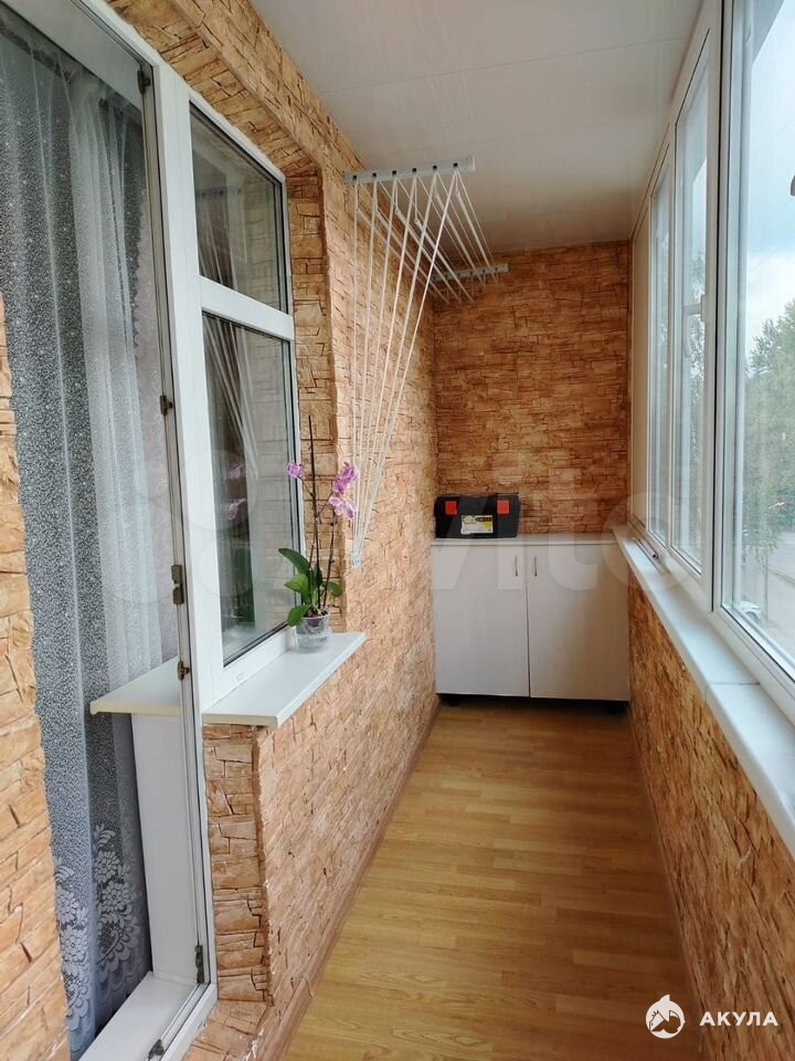 Есть большая застеклённая лоджия — она отделана искусственным камнем, на полу ламинат, установлен подвесной потолок. Летом там очень приятно проводить время; есть стол для компьютера, розетка — можно поставить настольную лампу.