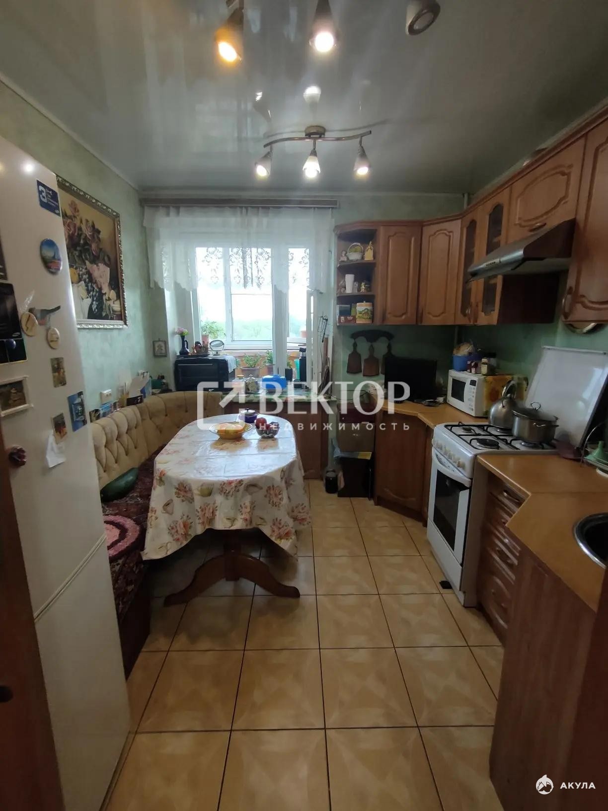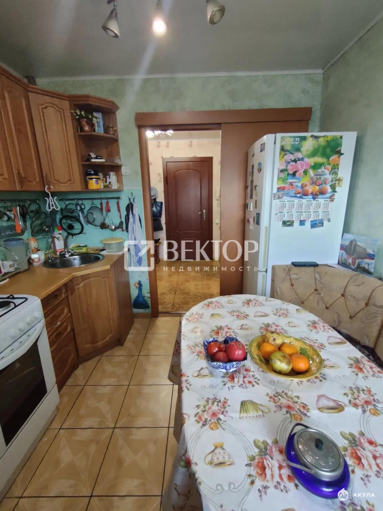 На кухне пол отделан плиткой, на стенах — виниловые обои под покраску, потолок — подвесной. Будущему владельцу останутся кухонный гарнитур, плита и вытяжка.