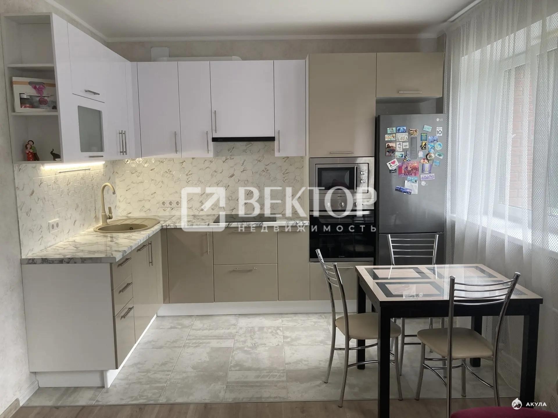 В квартире качественный евроремонт: стильный интерьер, современная мебель и техника (кухонный гарнитур, варочная панель, духовой шкаф, посудомоечная машина, СВЧ, холодильник).