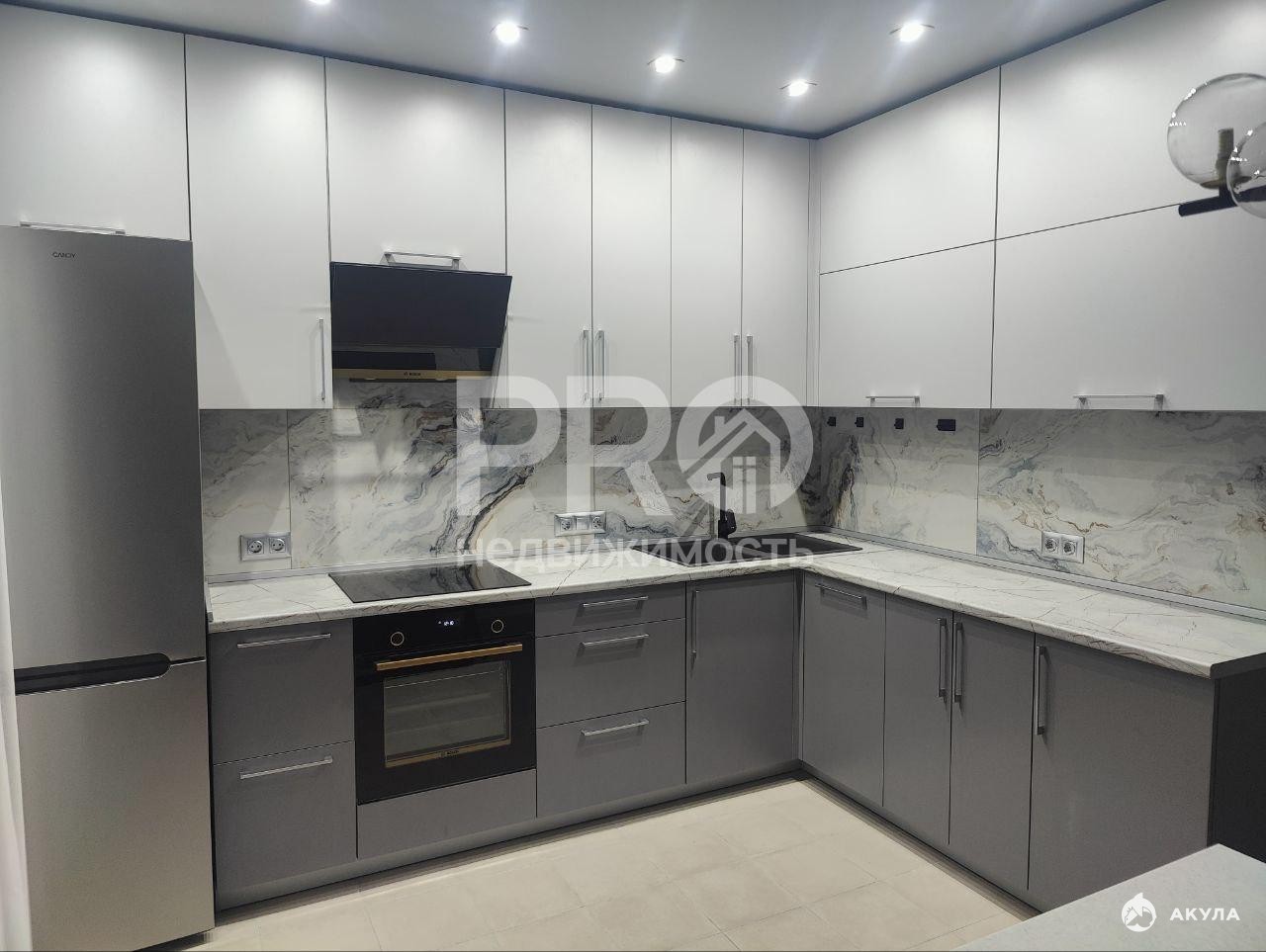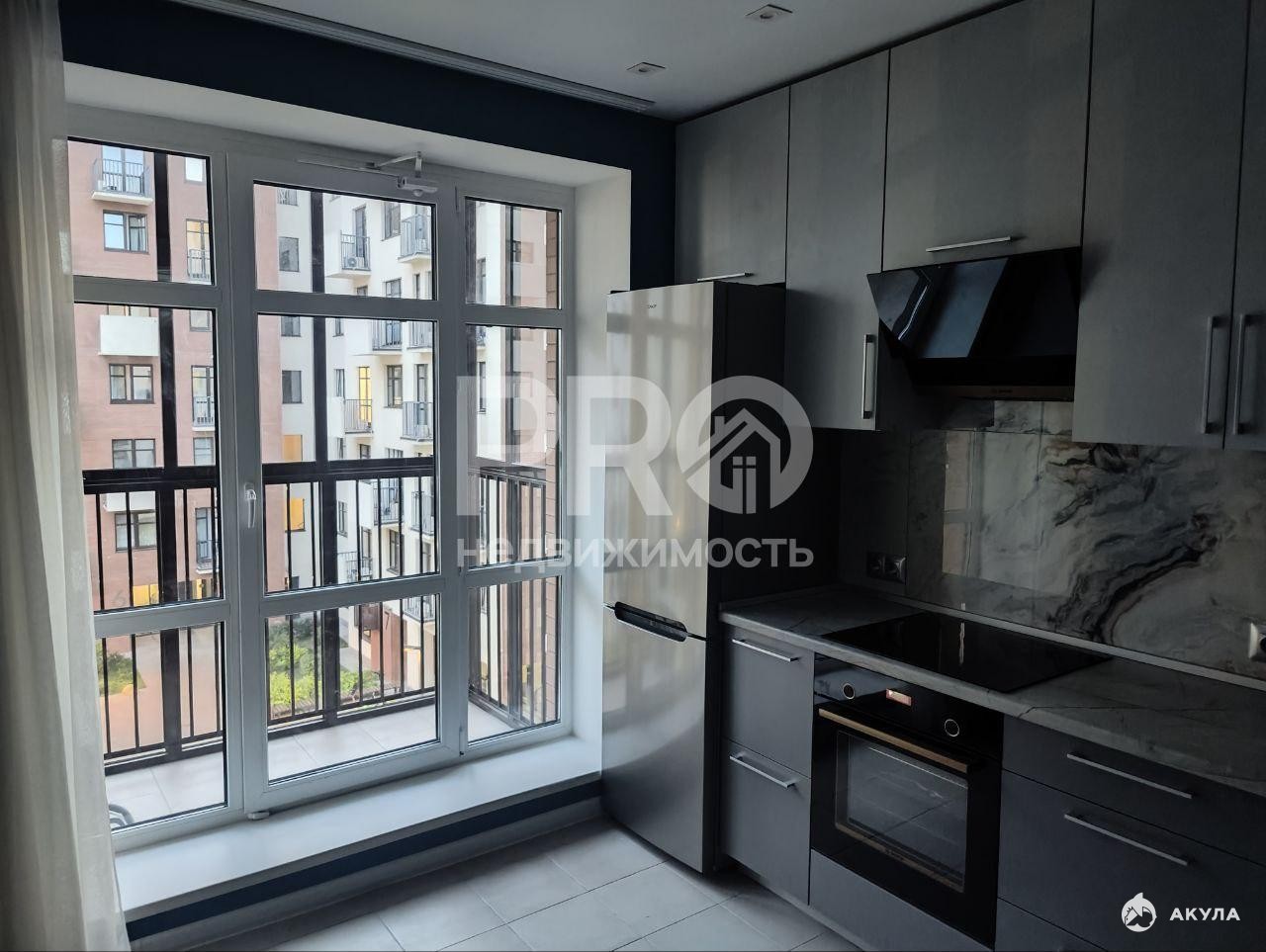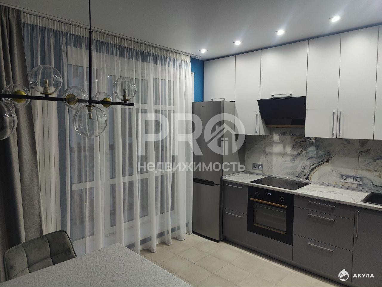 Панорамное остекление в гостиной и на просторной кухне, полностью оборудованной новой встраиваемой техникой , что делает её удобной и функциональной.