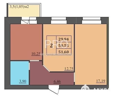 Площадь: 51, 6 м² (2-комнатная)