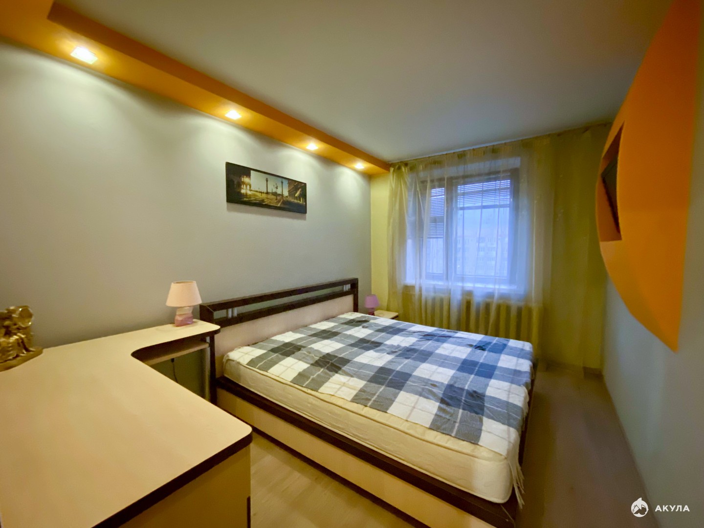 - В отделке стен использованы декоративная штукатурка, обои под покраску, обои. На полу уложен ламинат и керамогранит. Натяжные потолки во всей квартире.