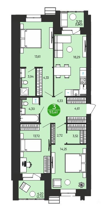 - просторный лоджии от 3, 2 до 12, 6 м2, с теплым остеклением, как дополнительная функциональная зона здесь, например, можно организовать лаундж-зону, рабочее место, домашний спортзал, установить беговую дорожку или цветочную оранжерею.