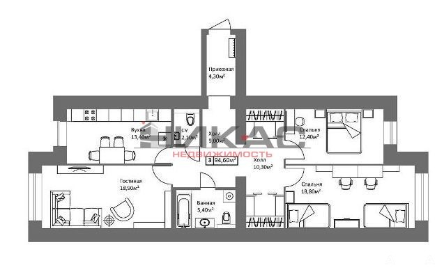 Комфортная планировка: удобная и светлая кухня - 13.40 кв.м., лоджия с витражным остеклением, просторные комнаты 18, 9 кв.м., 18, 8 кв.м, 12, 4 кв.м,