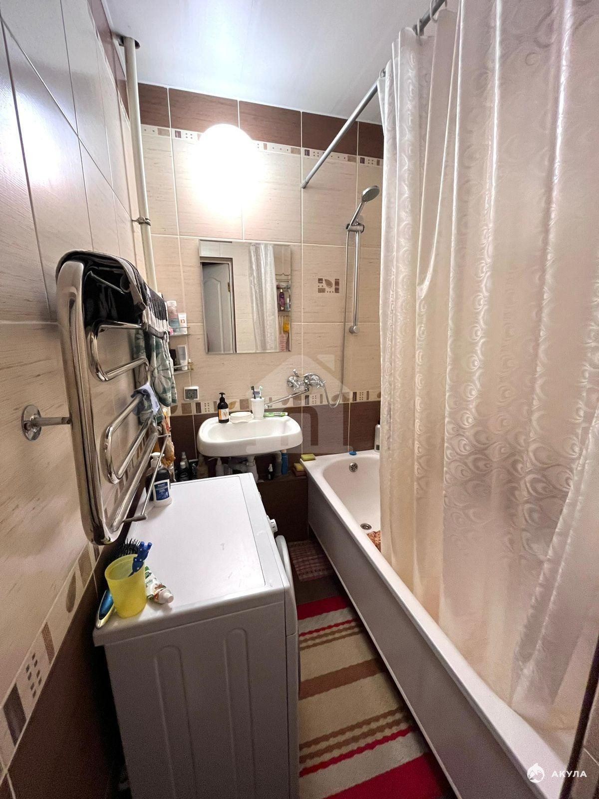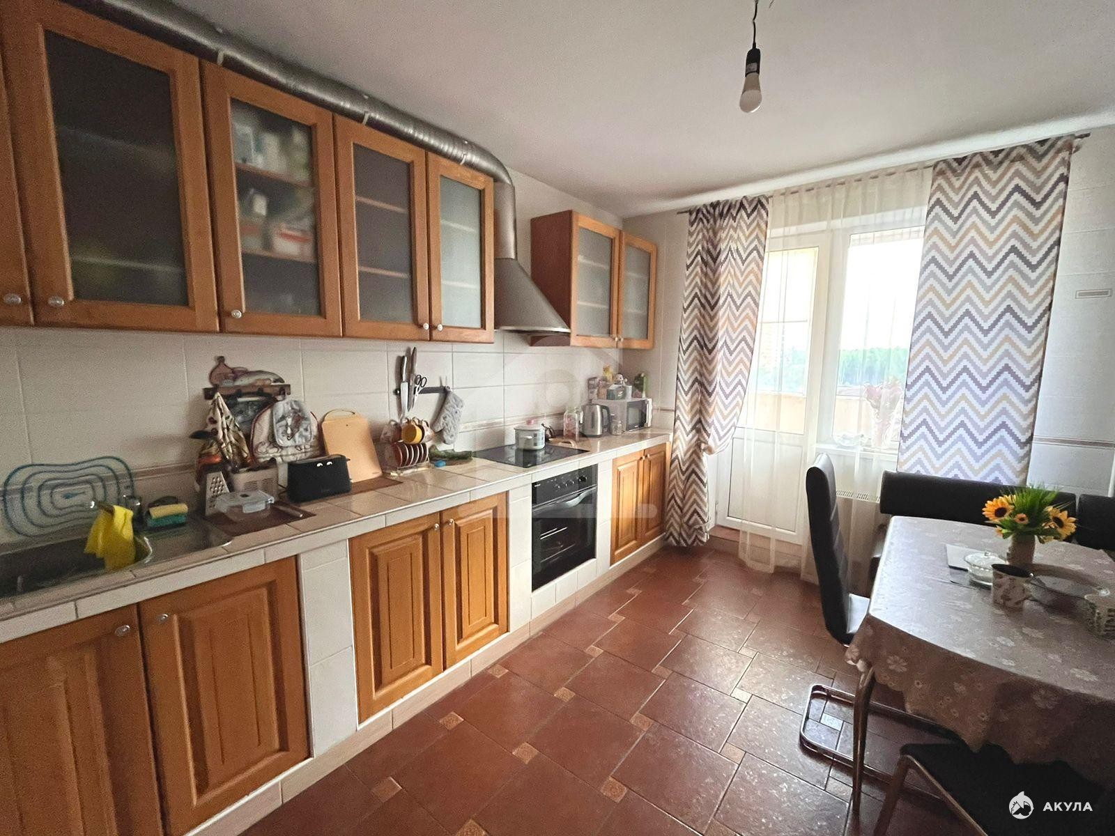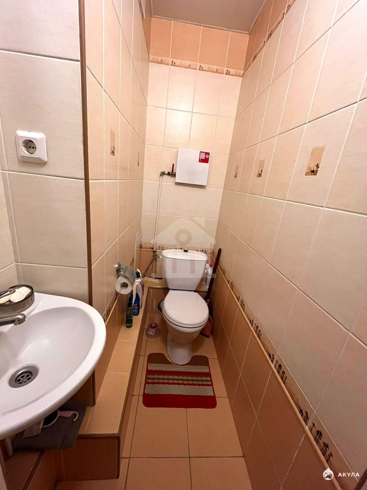Квартира не угловая, теплая. В прихожей, кухне, ванной комнате, туалете и на лоджии - пол покрыт плиткой, в одной комнате ламинат, в двух остальных линолеум. В кухне и прихожей стены покрыты плиткой.