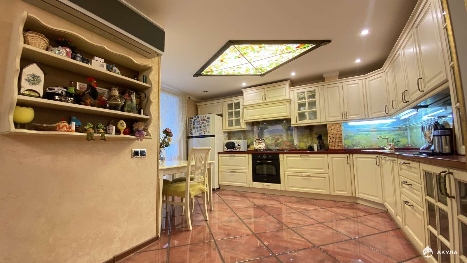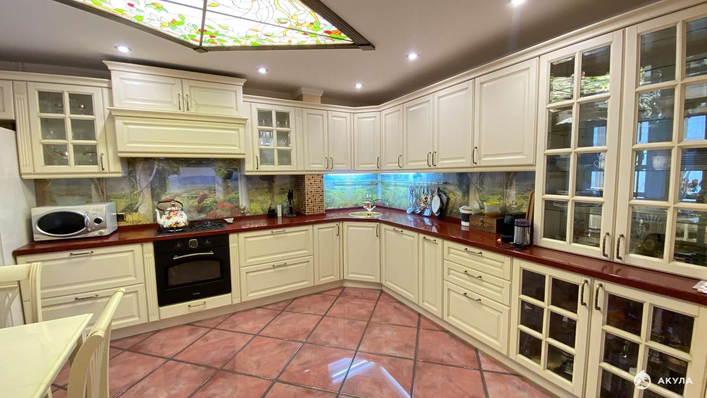 Сердце дома кухня-гостиная 43, 5 м2, она объединит за своим столом не только семью, но и ваших близких и друзей, здесь хватит места на всех. Остается кухонный гарнитур из натурального дерева, встроенная техника: духовой шкаф и варочная поверхность Korting, посудомоечная машина Haier и кондиционер.