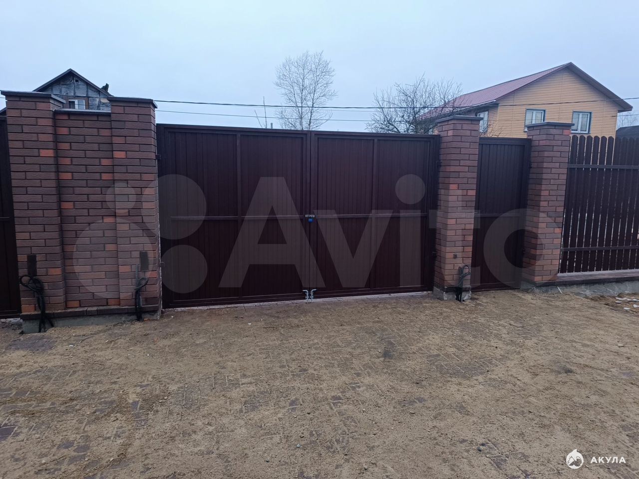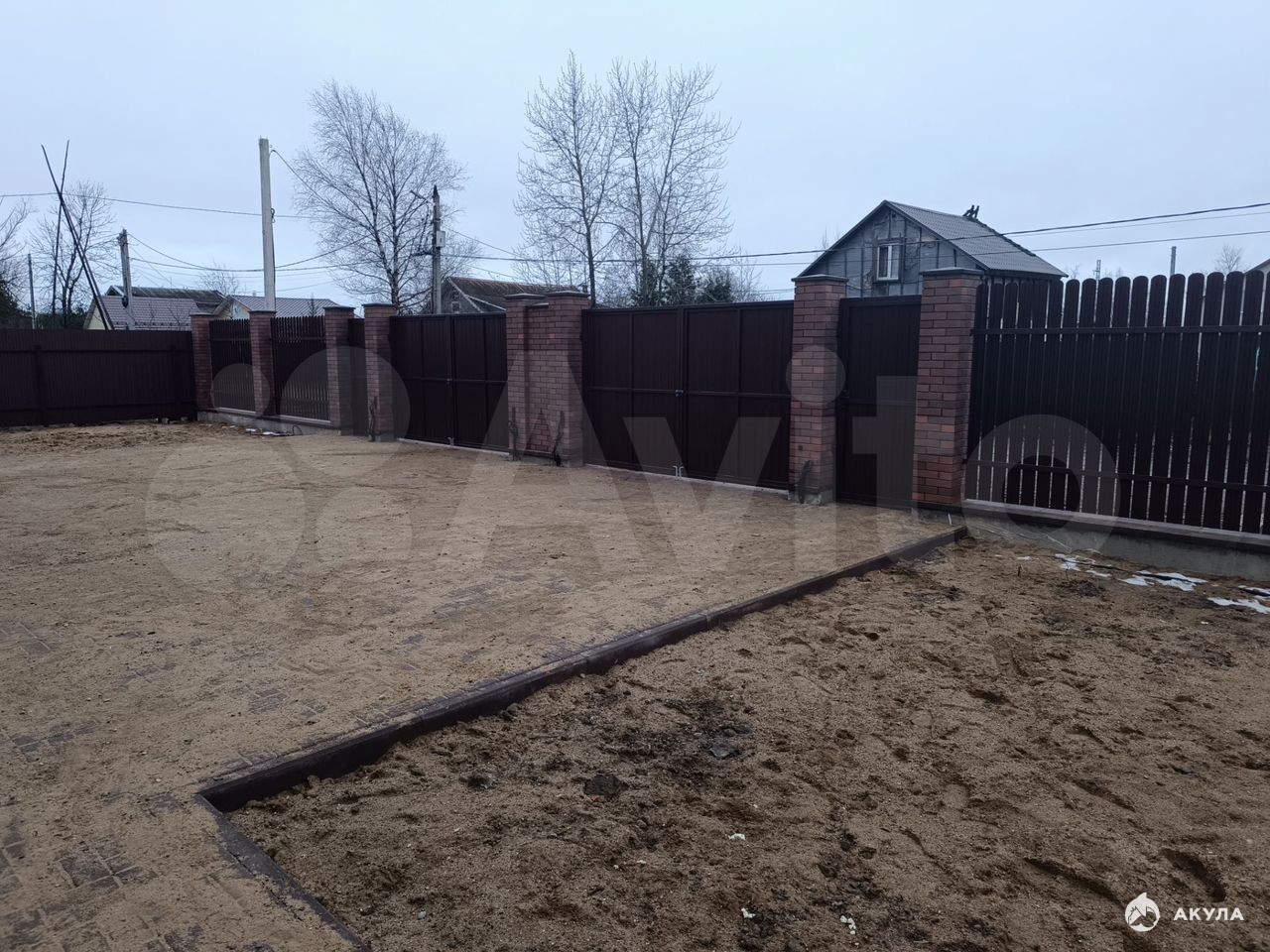 Парковка - тротуарная плитка 10 см. толщиной. Забор на сваях из Баварского кирпича.