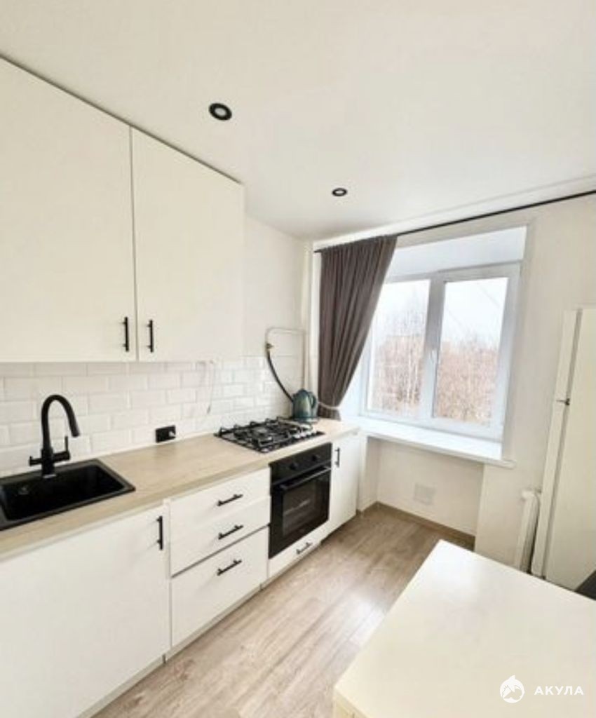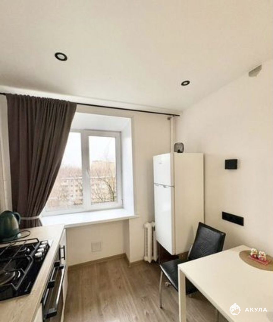 Встроенный кухонный гарнитур в нежно-кремовых тонах. Варочная панель, духовой шкаф, большой холодильник, также есть телевизор и стиральная машина. Дополнительно могут предоставить сушилку, гладильную доску, утюг.