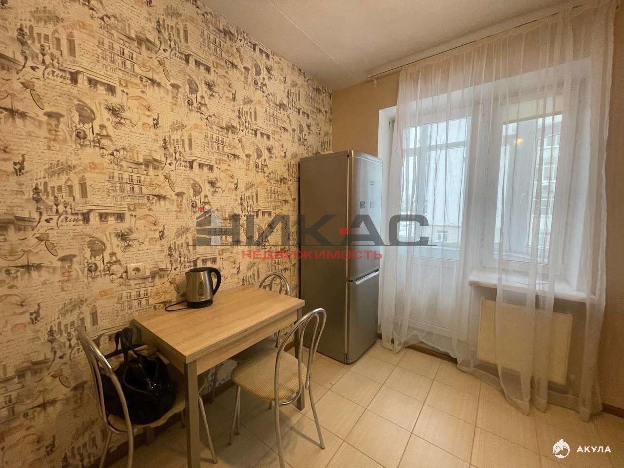 Кухонный гарнитур, холодильник, плата газовая, микроволновая печь, электрический чайник, стол обеденный со стульями.