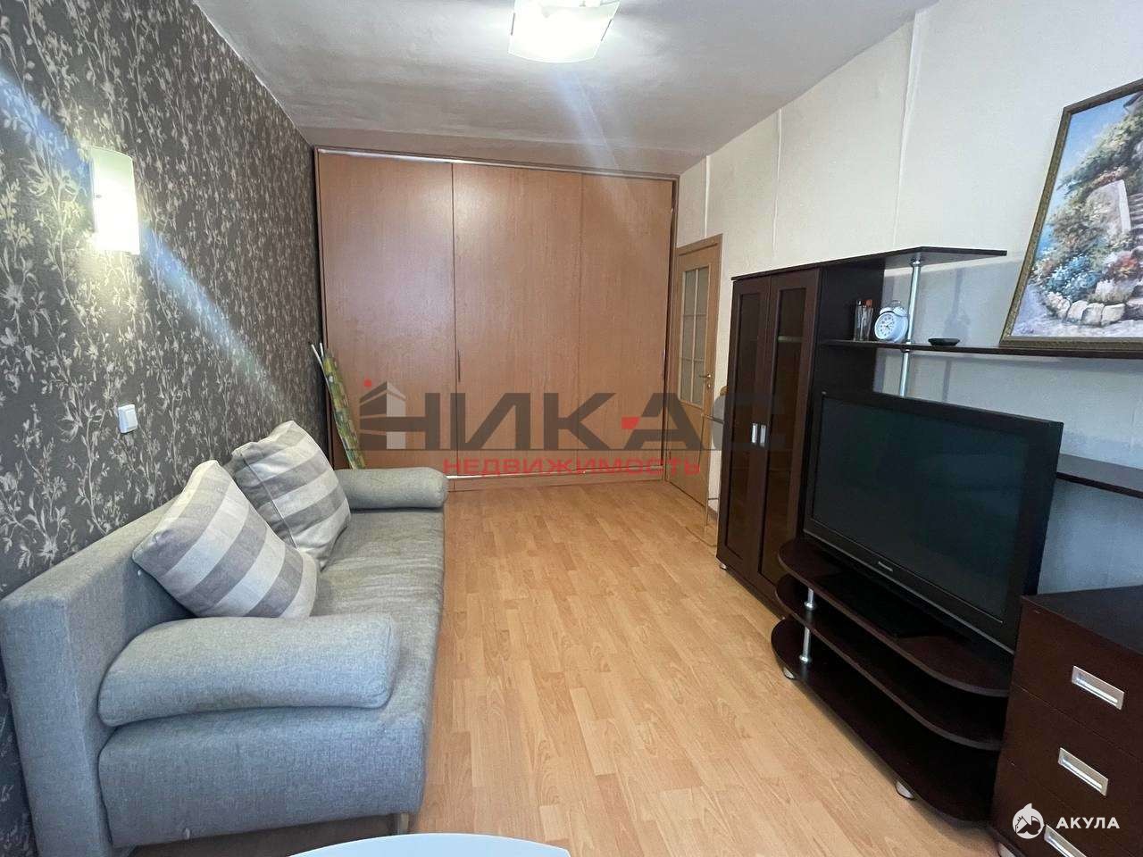 Большой встроенный шкаф купе, диван раскладной евро книжка, стенка, телевизор.