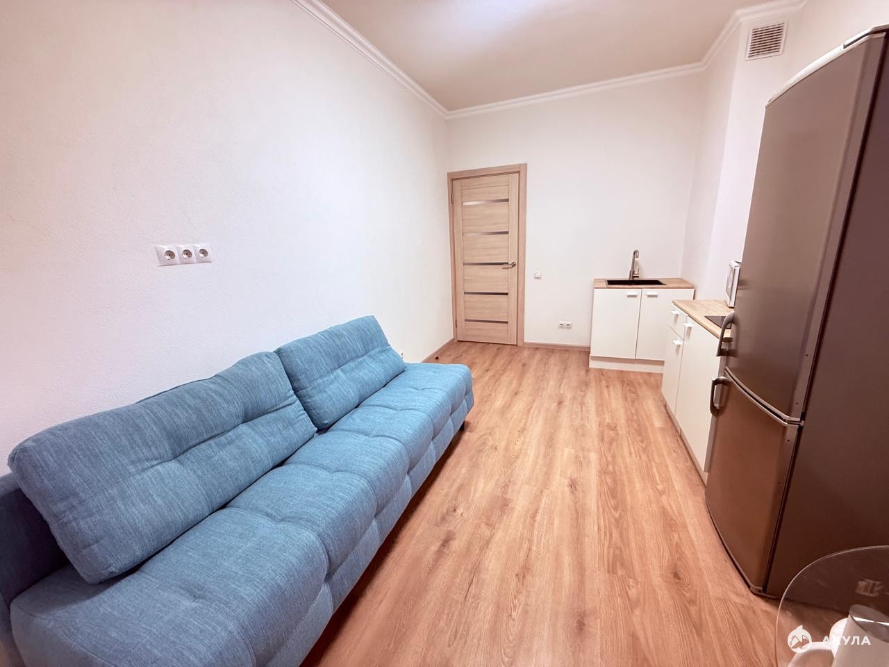 кухня 14 м2, установлен компактный кухонный гарнитур, холодильник, удобный диван, как дополнительное спальное.