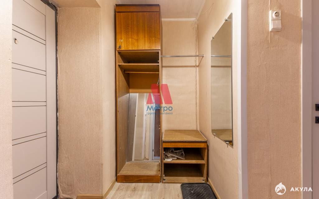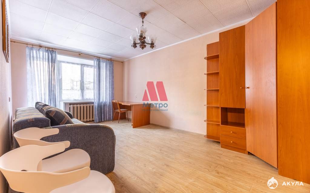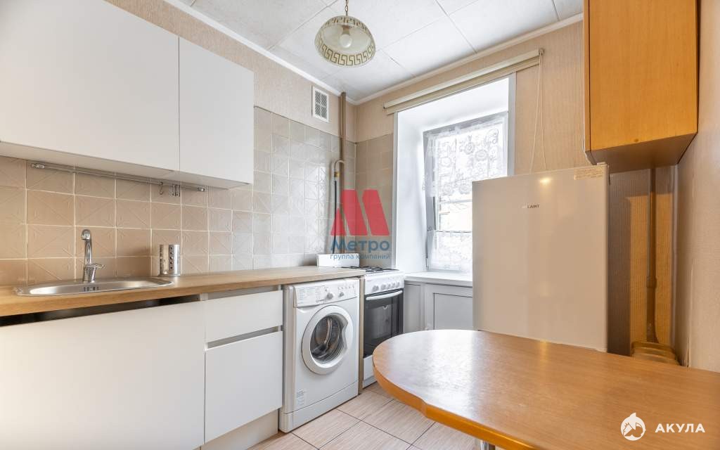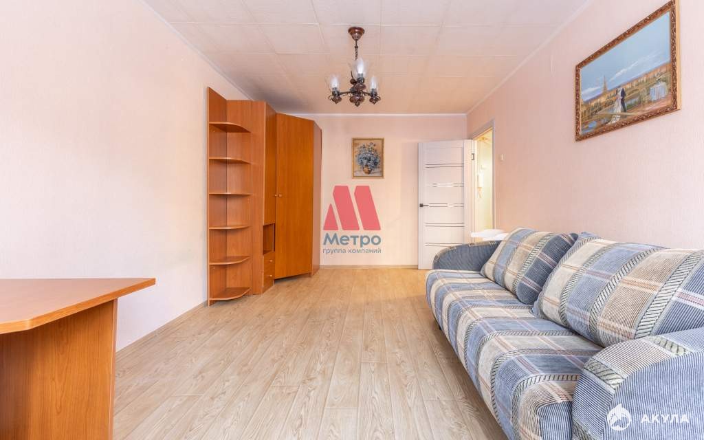 В квартире двухместный диван, вместительный шкаф, стиральная машина, холодильник, стол.