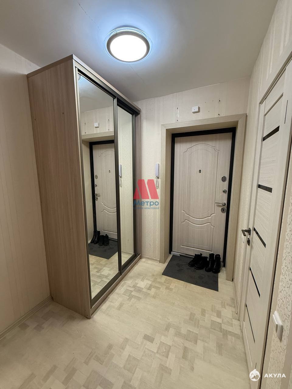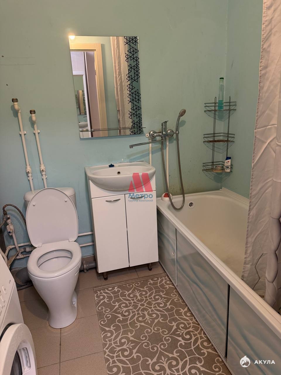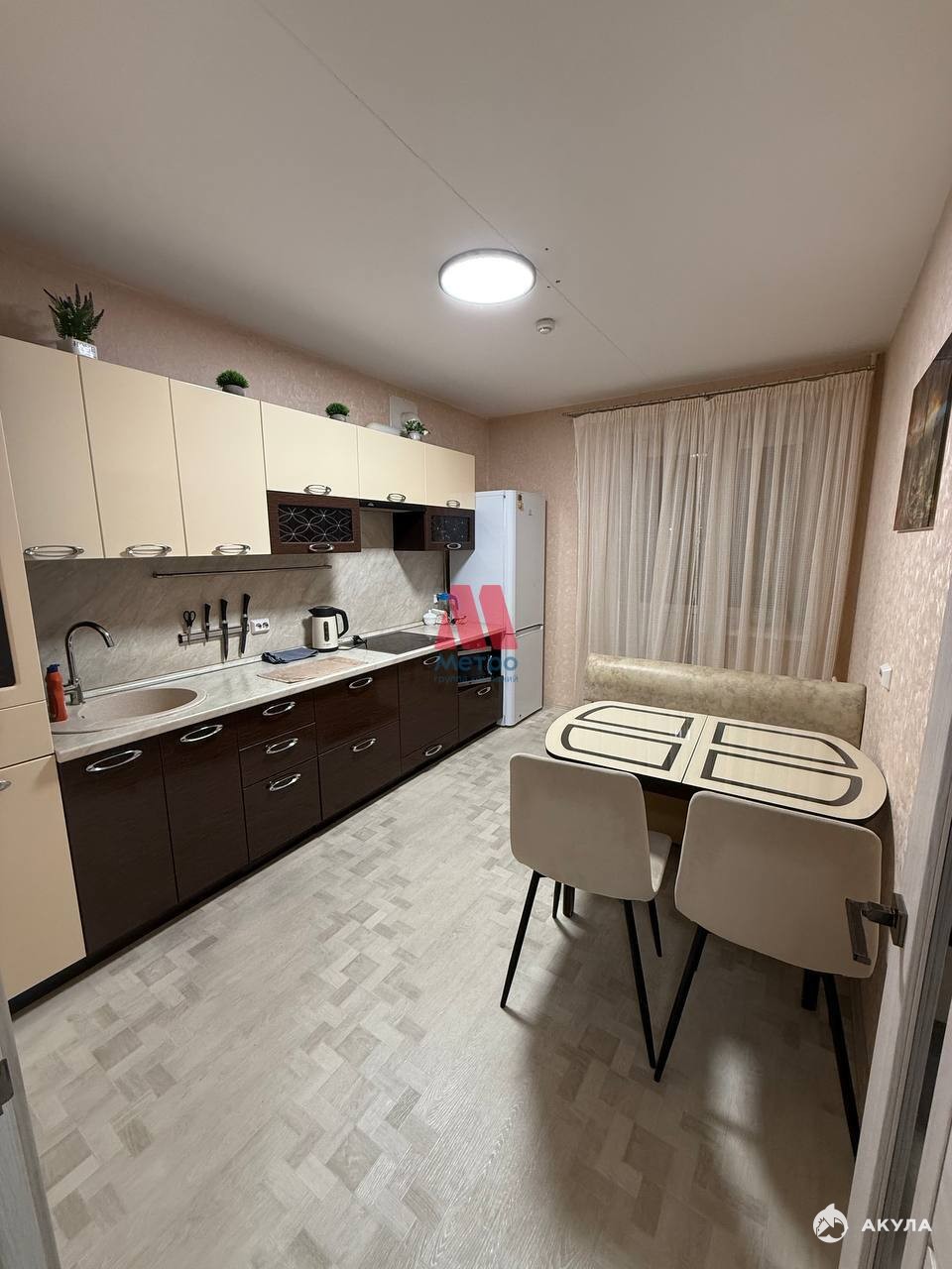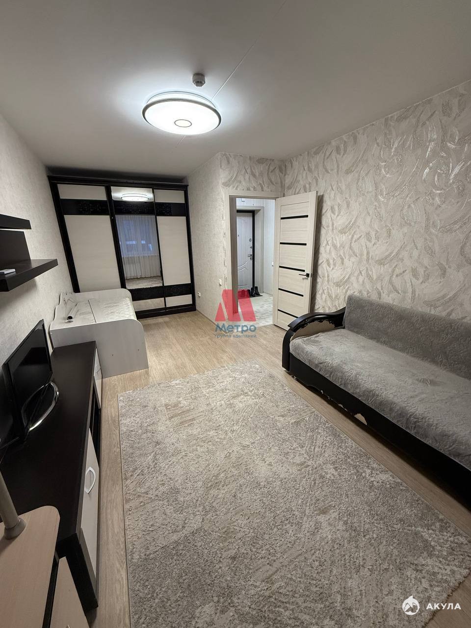 Имеется все необходимое для проживания: диван, телевизор, компьютерный стол, шкафы-купе, кухня, обеденная зона, холодильник, стиральная машина.