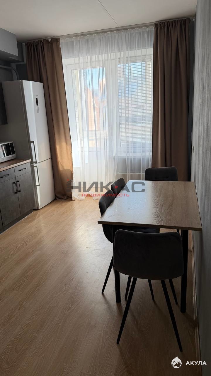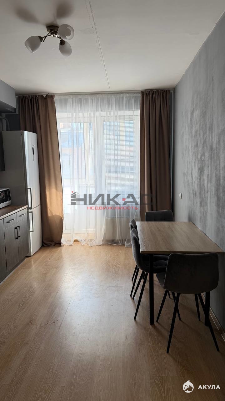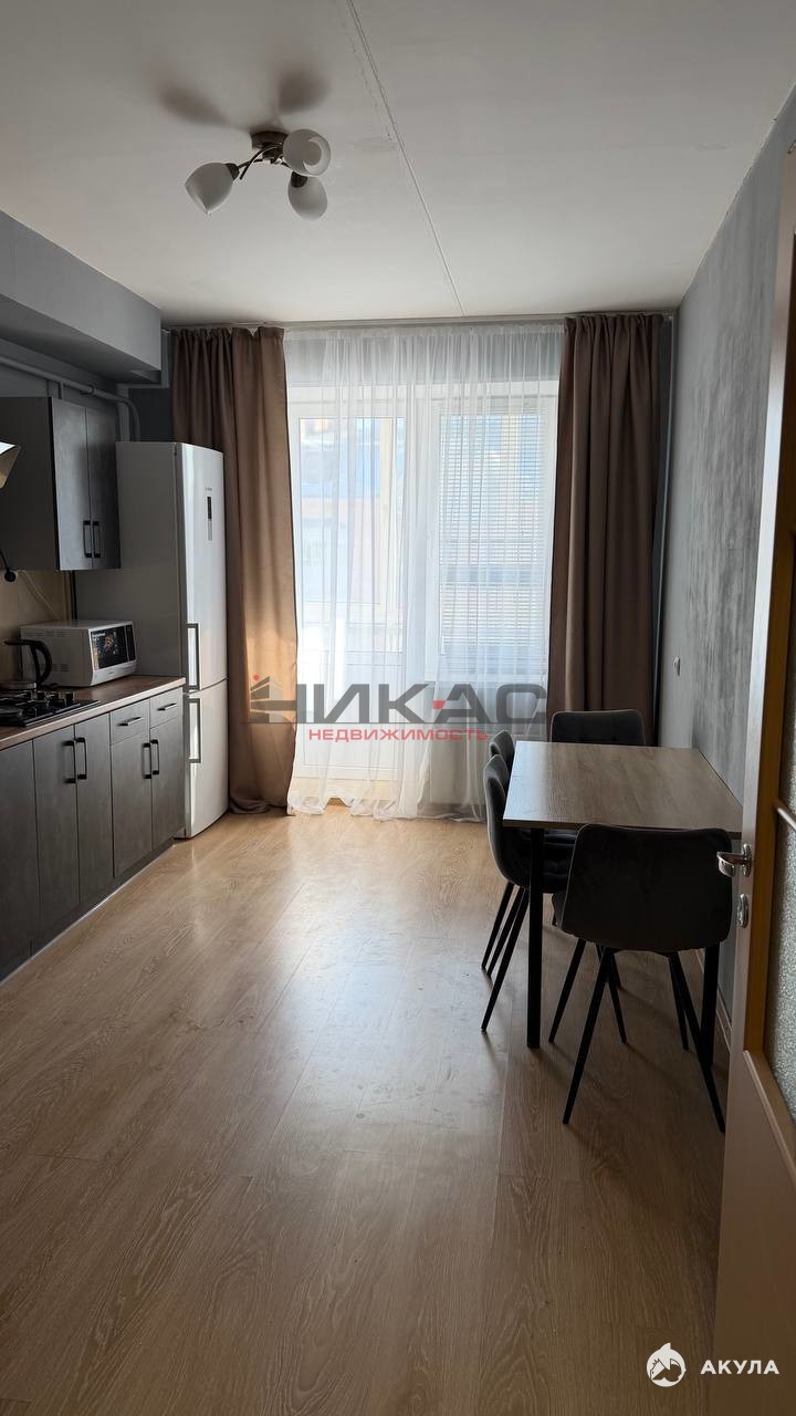 Квартира оснащена люстрами, карнизами, шторами и тюлью.