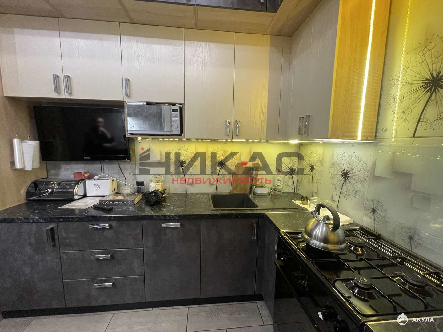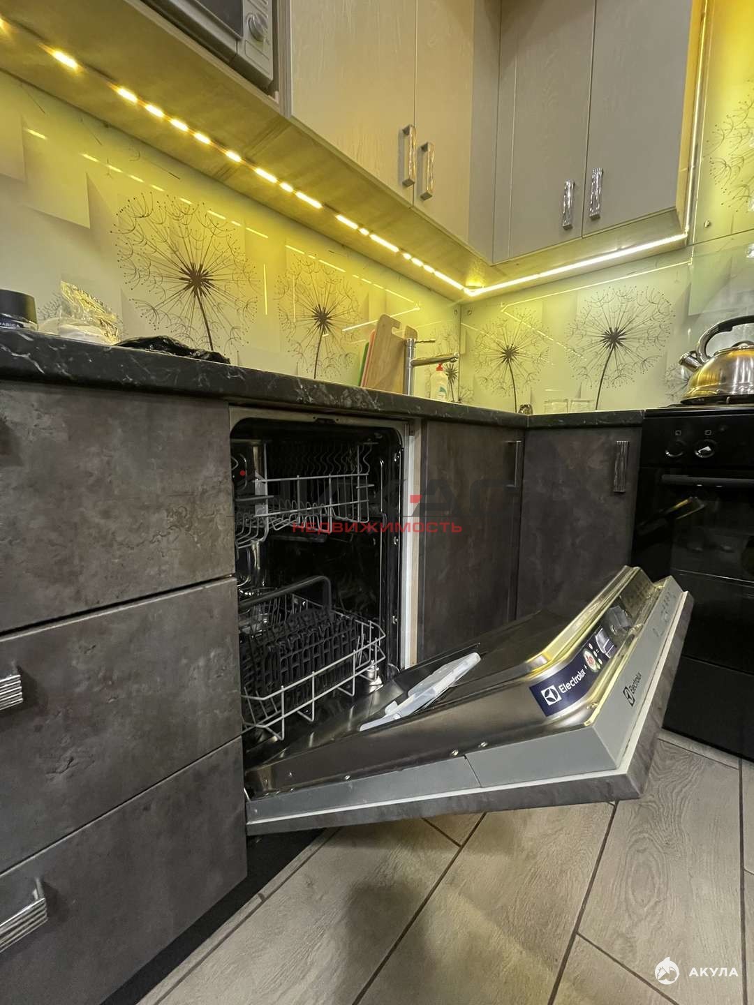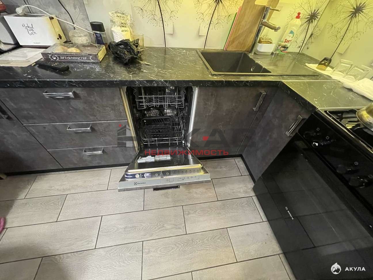 Встроенный кухонный гарнитур, плита газовая, посудомоечная машина, микроволновая печь, холодильник, обеденная группа, два телевизора, диван раскладной, робот пылесос, стиральная машина автомат, кровать двуспальна, стенка, вещевой шкаф.