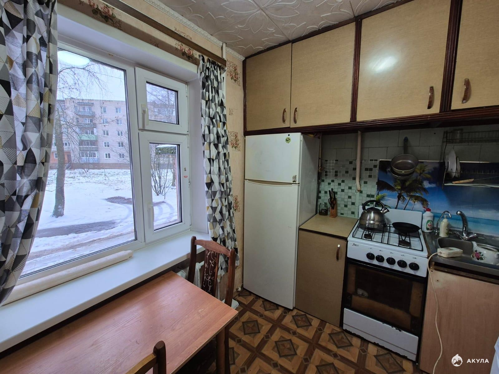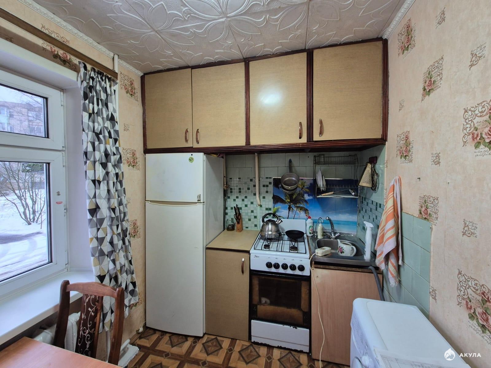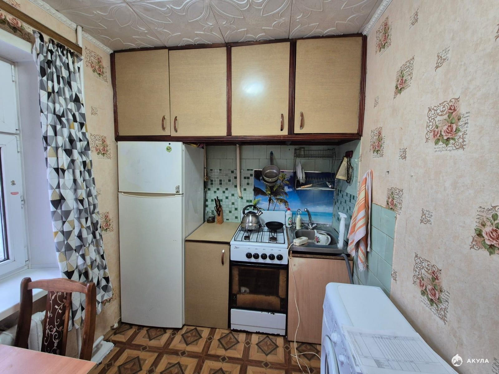 Общая площадь: 44 кв. м., кухня 6 кв. м., сан. узел.раздельный. Есть газовая плита, кухонный гарнитур, стол со стульями на кухне, стиральная машина, холодильник, кровать, шкафы, стенка, кровать.